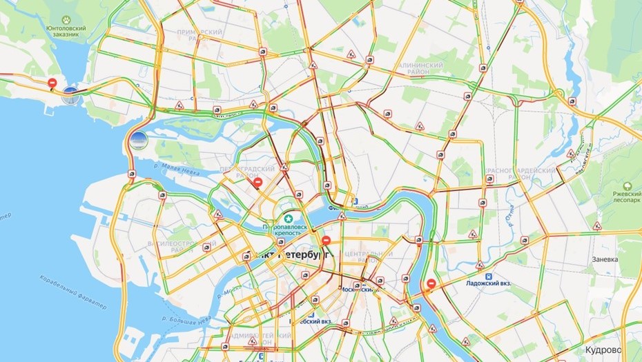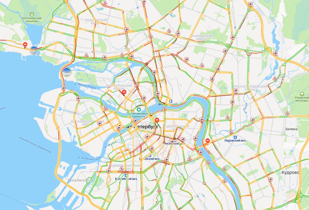Плотнее всего в Северной столице в 20:00 по мск оказалось в центре и на севере. Дорожную ситуацию также осложняют запланированные ремонтные работы и перекрытия.