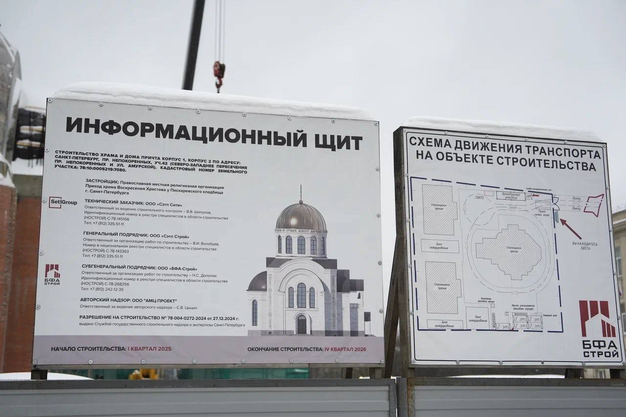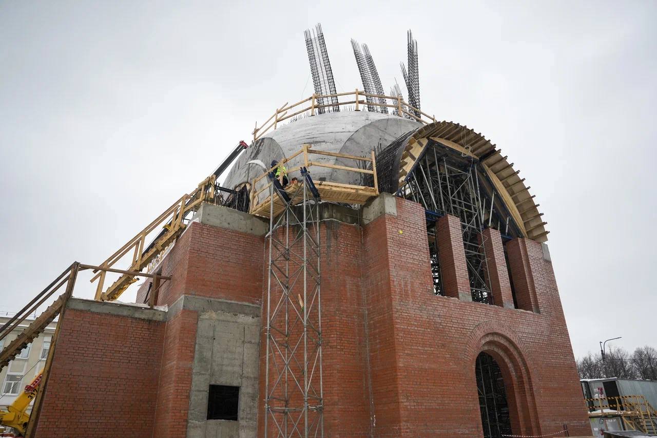 Число связано с 900 днями блокады Ленинграда. Храм начали строить год назад, и работы идут по графику, отчитался Бельский.
