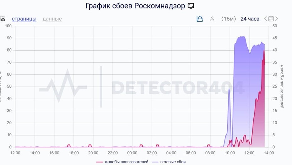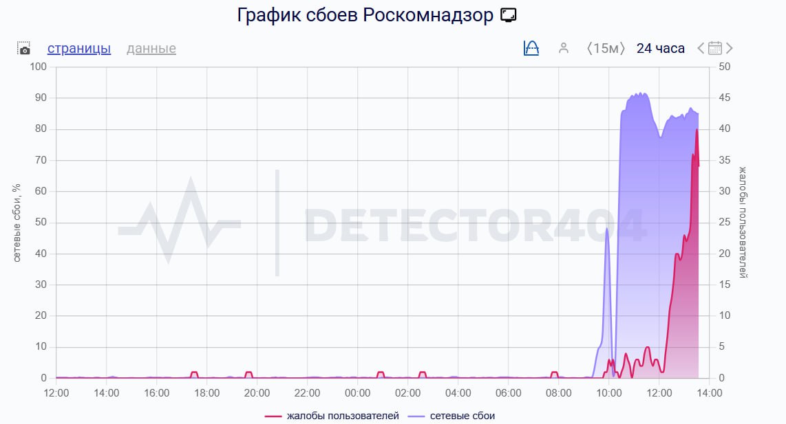 По данным сервиса Downdetector на 13:30 поступило 168 жалоб о сбое работы сайта Роскомнадзора.