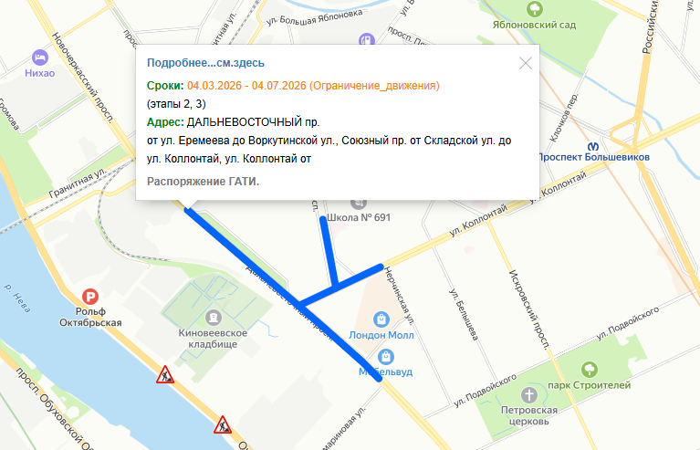 Движение будет ограничено с 7 марта по 4 июля. Перекрытия затронут о Дальневосточный проспект (от улицы Еремеева до Воркутинской улицы), Союзный проспект (от Складской улицы до улицы Коллонтай), улицу Коллонтай (от Нерчинской улицы до Дальневосточного проспекта).