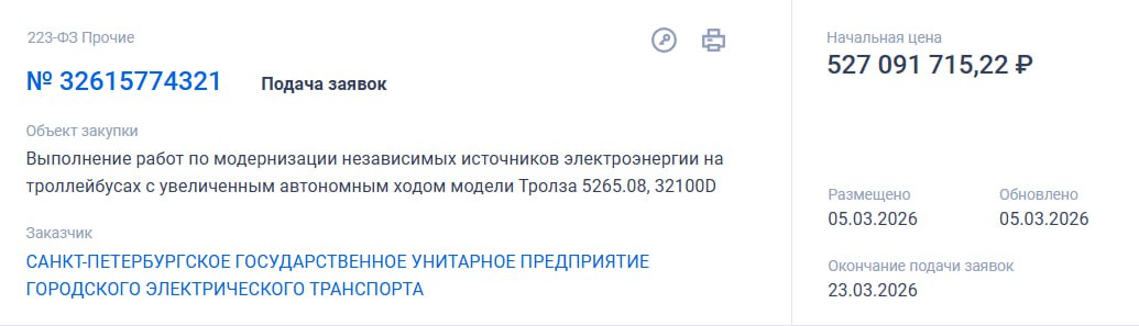 Закупка размещена предприятием 5 марта, заявки от участников принимают до 23 марта, итоги подведут 27 марта.