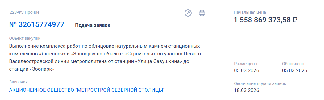 Закупку 5 марта разместил "Метрострой Северной столицы", заявки принимают до 18 марта, итоги будут подведены 25 марта.