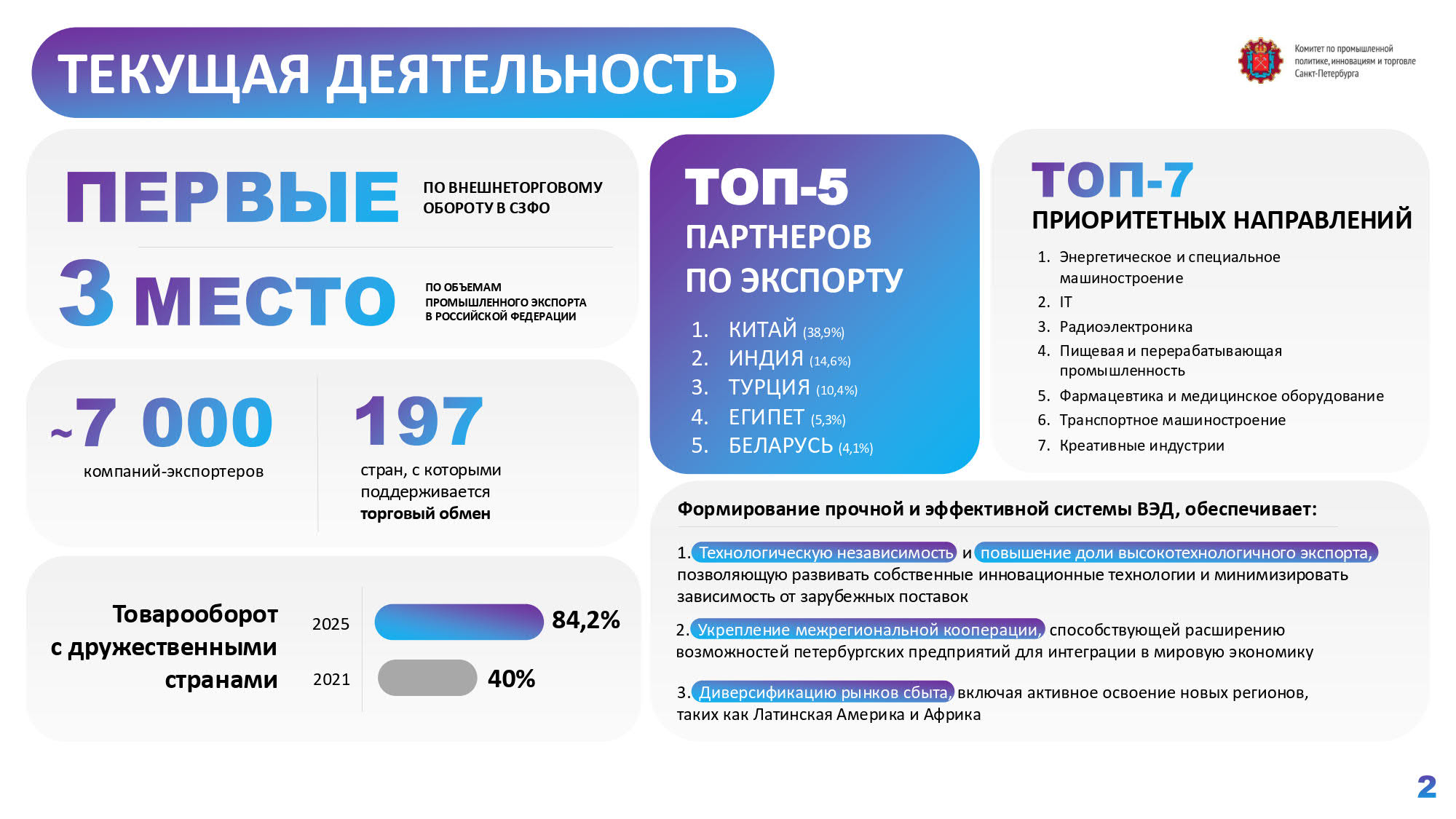 Петербург в данный момент ведёт торговлю со 197 странами. Экспорт осуществляется в 153 государства. Доля дружественных стран в товарообороте города составляет 84%. За 11 месяцев 2025 года промышленный экспорт вырос на 26%. Пятью самыми крупными партнёрами города стали Китай (38,9%), Индия (14,6%), Турция (10,4%), Египет (5,3%) и Белоруссия (4,1%).