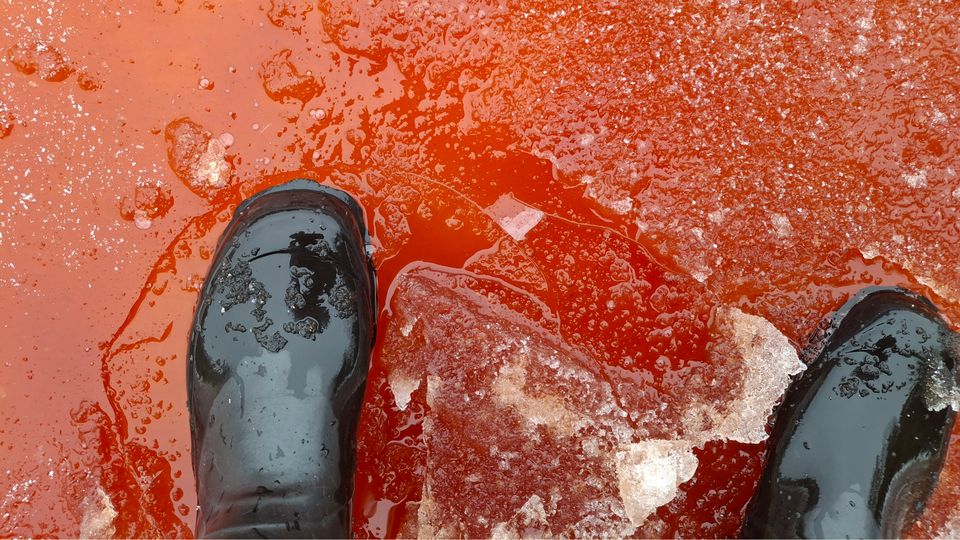В некоторых местах лёд окрасился в красно-коричневый, а местами — в кроваво-красный цвет, сообщил Финский институт окружающей среды (Syke).