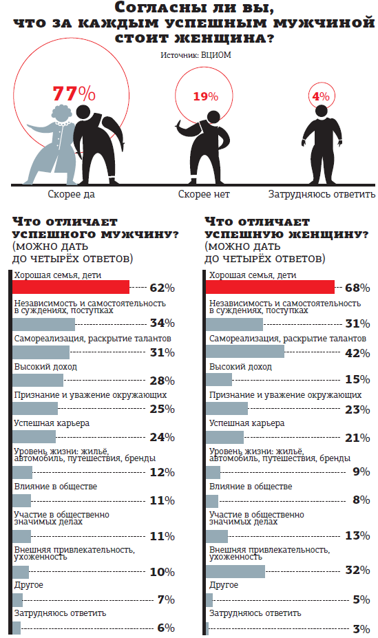 Главным показателем успешности человека является хорошая семья и дети. По мнению участников опроса, проведённого ВЦИОМ накануне 8 Марта, это одинаково справедливо как для женщин, так и для мужчин (68 и 62% голосов соответственно).