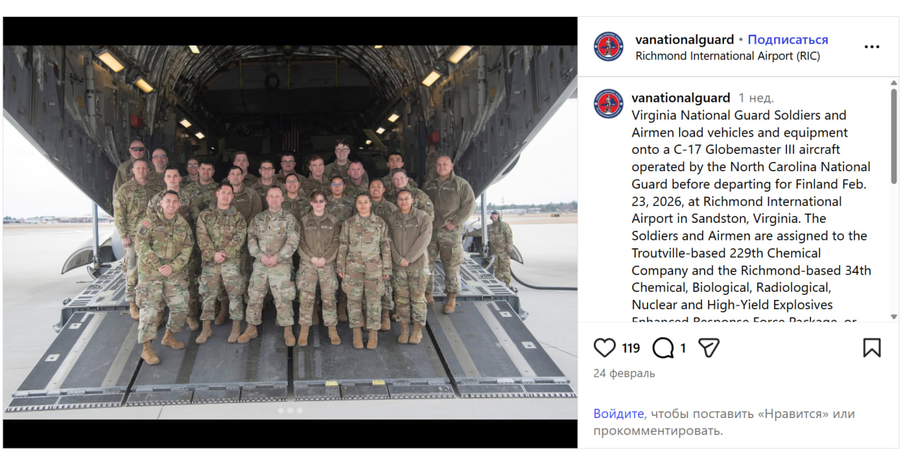 "Национальная гвардия Вирджинии (США) провела учения по поиску опасных веществ и действиям с ними в финском городе Лаппеенранта в первую неделю марта", — указано в публикации.