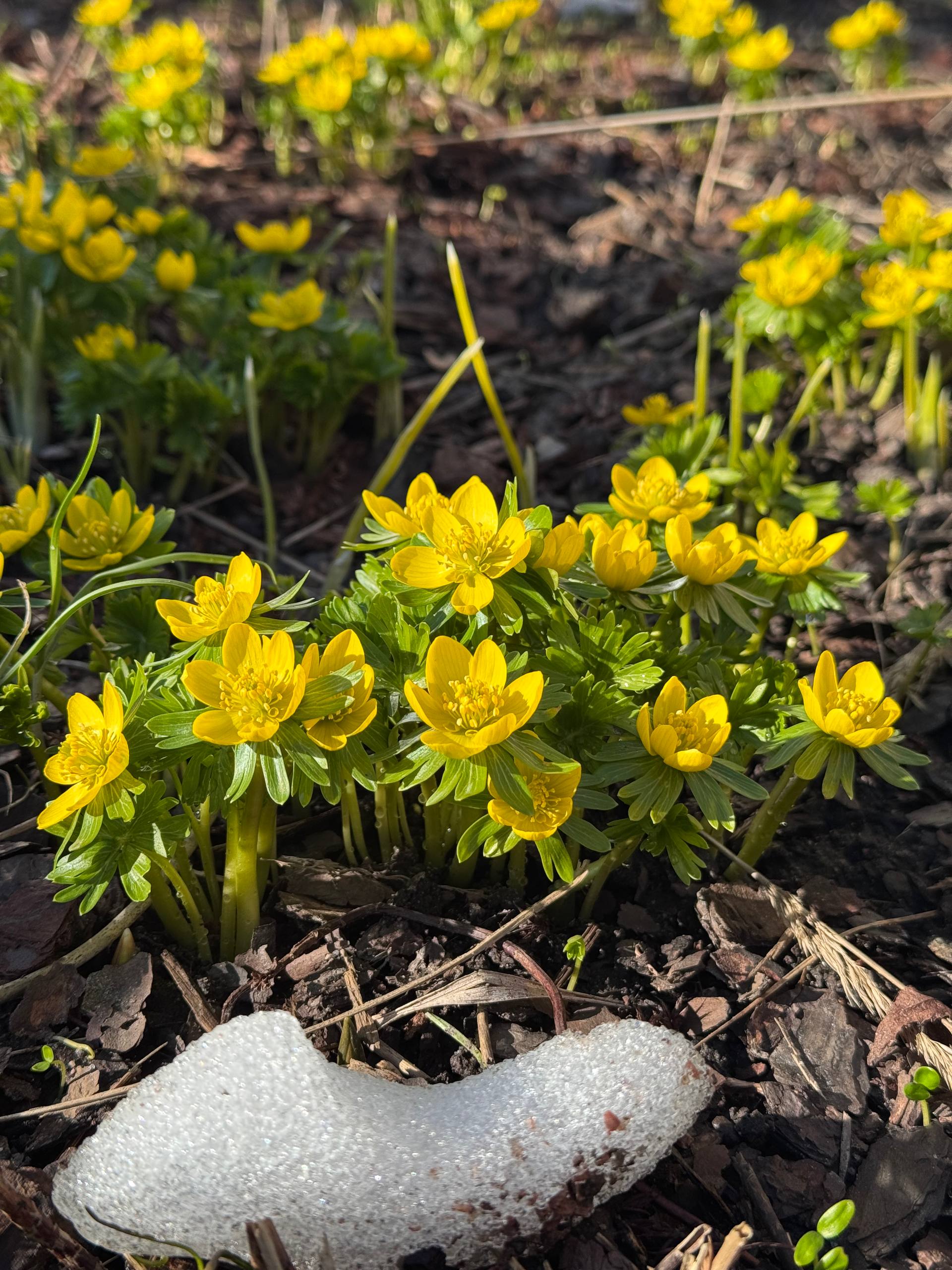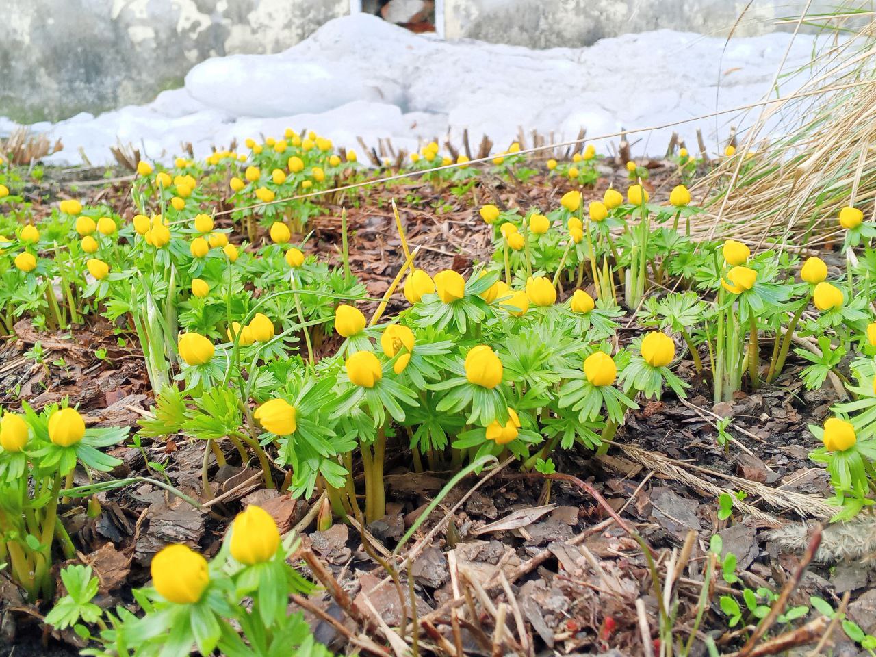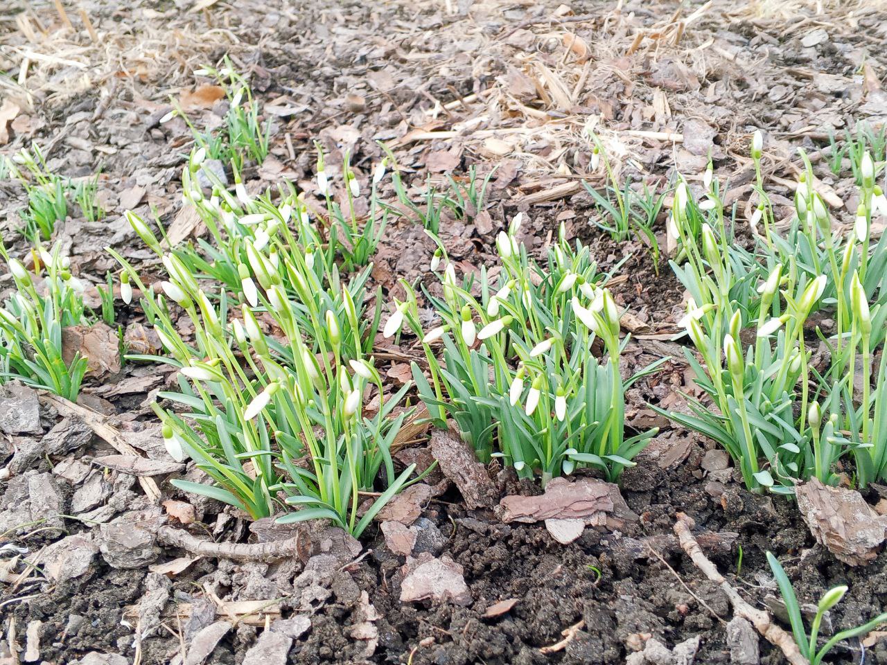 Подснежники при этом только проклюнулись и ещё не успели распуститься. В саду они растут по соседству с весенниками.