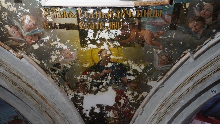 В процессе расчистки реставраторы раскрыли фрагменты росписи масляными красками по штукатурке с изображением Святых Великомучениц Екатерины, Дарьи, Анастасии и Аглаи.