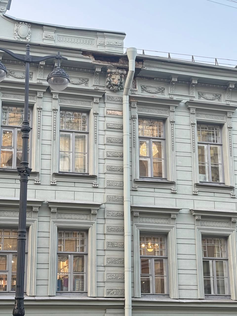 Как передаёт корреспондент "ДП", место обрушения на Большой Морской, 33, сейчас огорожено предупреждающей лентой. Отломился значительный кусок карниза, на тротуаре лежат обломки кирпичей. Это особняк Салова, построенный в 1871 году (архитектор Василий Штром). Сейчас в здании находится Детская библиотека имени Пушкина.