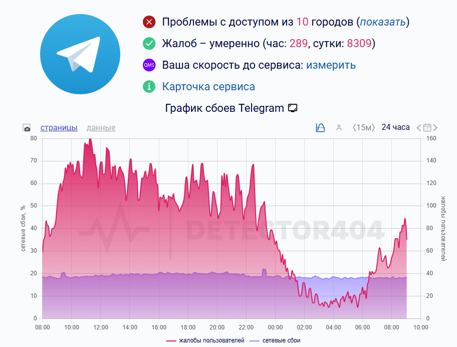 На работу Telegram жалуются 8% жителей Петербурга. По всей России жалобы на работу мессенджера поступают уже вторые сутки. Пользователи сообщают о сбоях в работе сайта, мессенджера, отсутствии оповещений и невозможности загрузить медиа. За последние сутки зафиксировано более 8300 жалоб по стране.