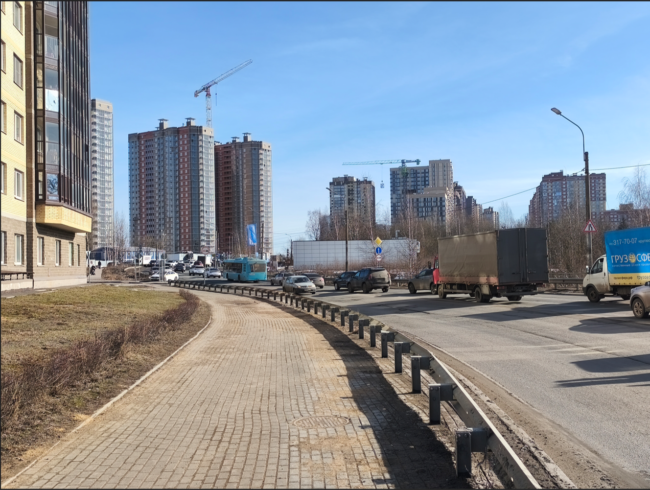 Сейчас на проспекте регулярно скапливаются пробки, вызванные эффектом "бутылочного горлышка": дорога после моста через Славянку сужается в сторону Колпино. Вдоль магистрали продолжается активное жилищное строительство, а другого сообщения с центром города у новых кварталов нет. Губернатор Александр Беглов в конце 2024 года обещал, что магистраль расширят до четырёх полос.