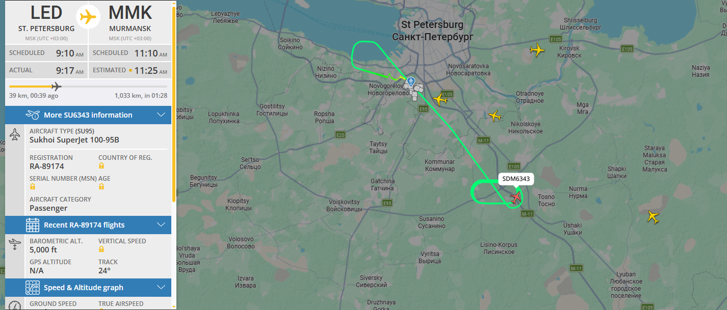 По данным сервиса Flightradar, рейс вылетел из Петербурга в 9:17, по расписанию в Мурманске он должен был приземлиться в 11:10. Однако в настоящее время Sukhoi SuperJet 100 авиакомпании "Россия" ожидает посадки в аэропорту Пулково. Он кружится в районе г. Тосно, вырабатывая топливо.