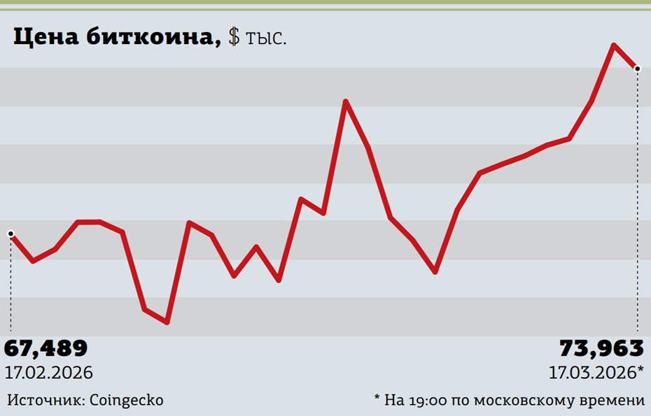 Котировки криптоактивов закончили длившуюся более месяца консолидацию и двинулись наверх. Биткоин за неделю подорожал на 5,8%. По данным информационного ресурса Coingecko, 17 марта в 19:00 по московскому времени самая популярная криптовалюта стоила $73,963 тыс. Эфир двигался гораздо сильнее. Его ценовая прибавка за 7 дней составила 13,9%, а котировка на тот же момент — $2316,76. Совокупная капитализация всех выпущенных криптомонет прибавила за неделю 4,5% и достигла $2,609 трлн. Однако перспективы дальнейшего роста вызывают у участников рынка сомнения.