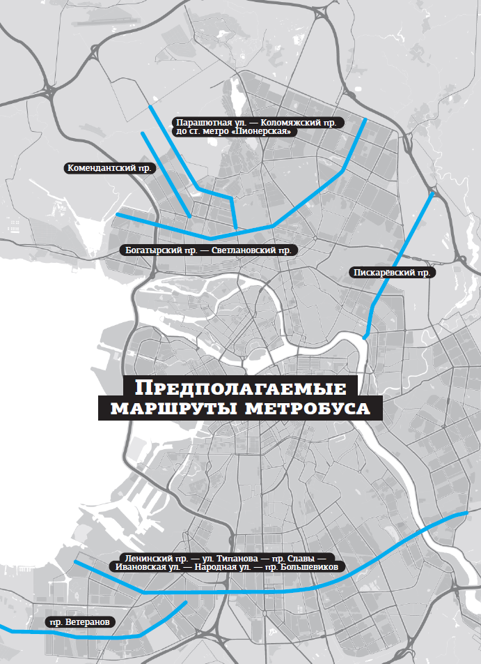 Георгий Фролов выделяет три варианта применения скоростного автобуса. Во–первых, это направления, где запуск метро планируется, но оно появится не ранее чем через 10–15 лет. Например, вдоль проспекта Ветеранов до ЖК "Солнечный город" или вдоль Пискарёвского проспекта. Сюда же можно отнести магистрали Приморского района — Парашютную ул. и Комендантский пр.