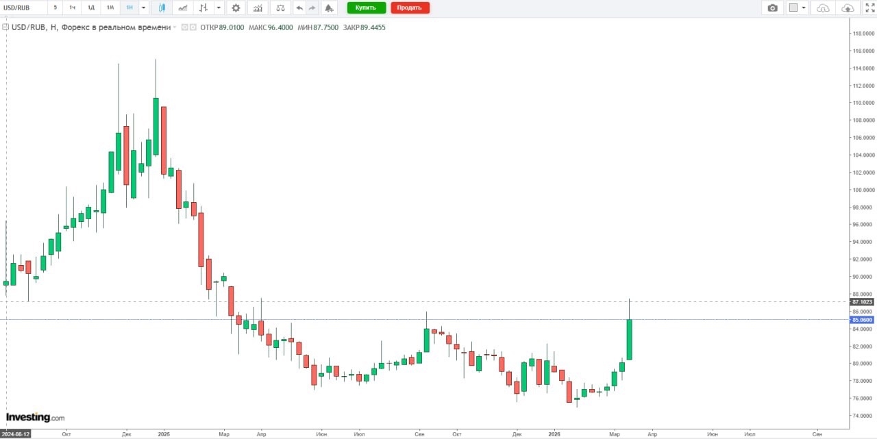 Курс доллара поднялся выше 87 рублей впервые с апреля 2024 года, следует из данных торгов.