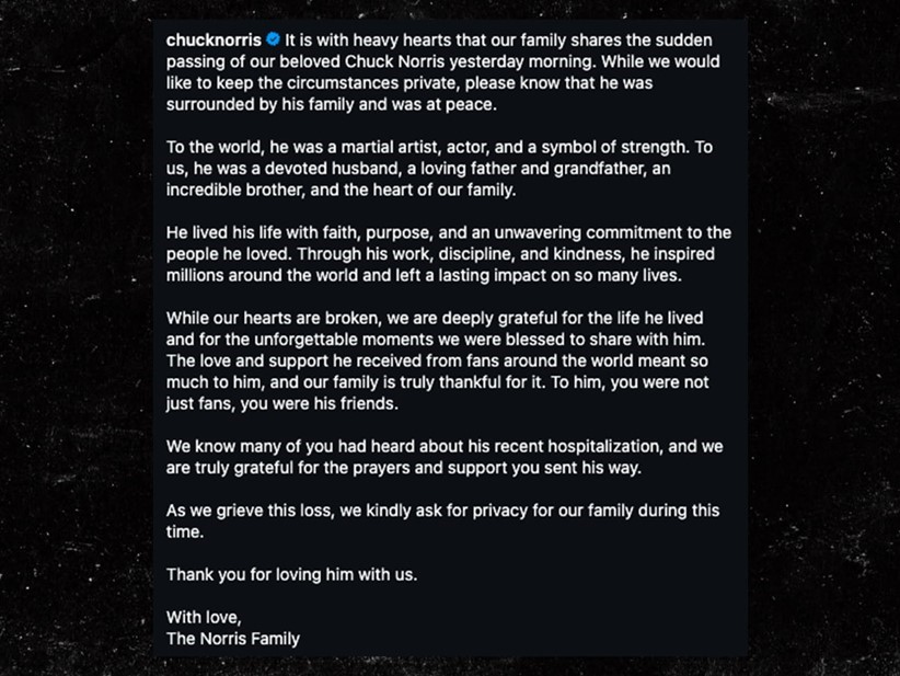 "С глубокой скорбью наша семья сообщает о внезапной кончине нашего любимого Чака Норриса вчера утром. Хотя мы хотели бы сохранить обстоятельства в тайне, пожалуйста, знайте, что он был окружён своей семьёй и обрёл покой", — приводит сообщение близких актёра TMZ.