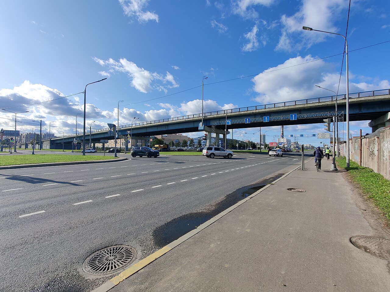 В сентябре прошлого года в Пушкине запустили движение по новому путепроводу через будущую Южную широтную магистраль. Запуск движения состоялся на два дня раньше официального открытия моста.