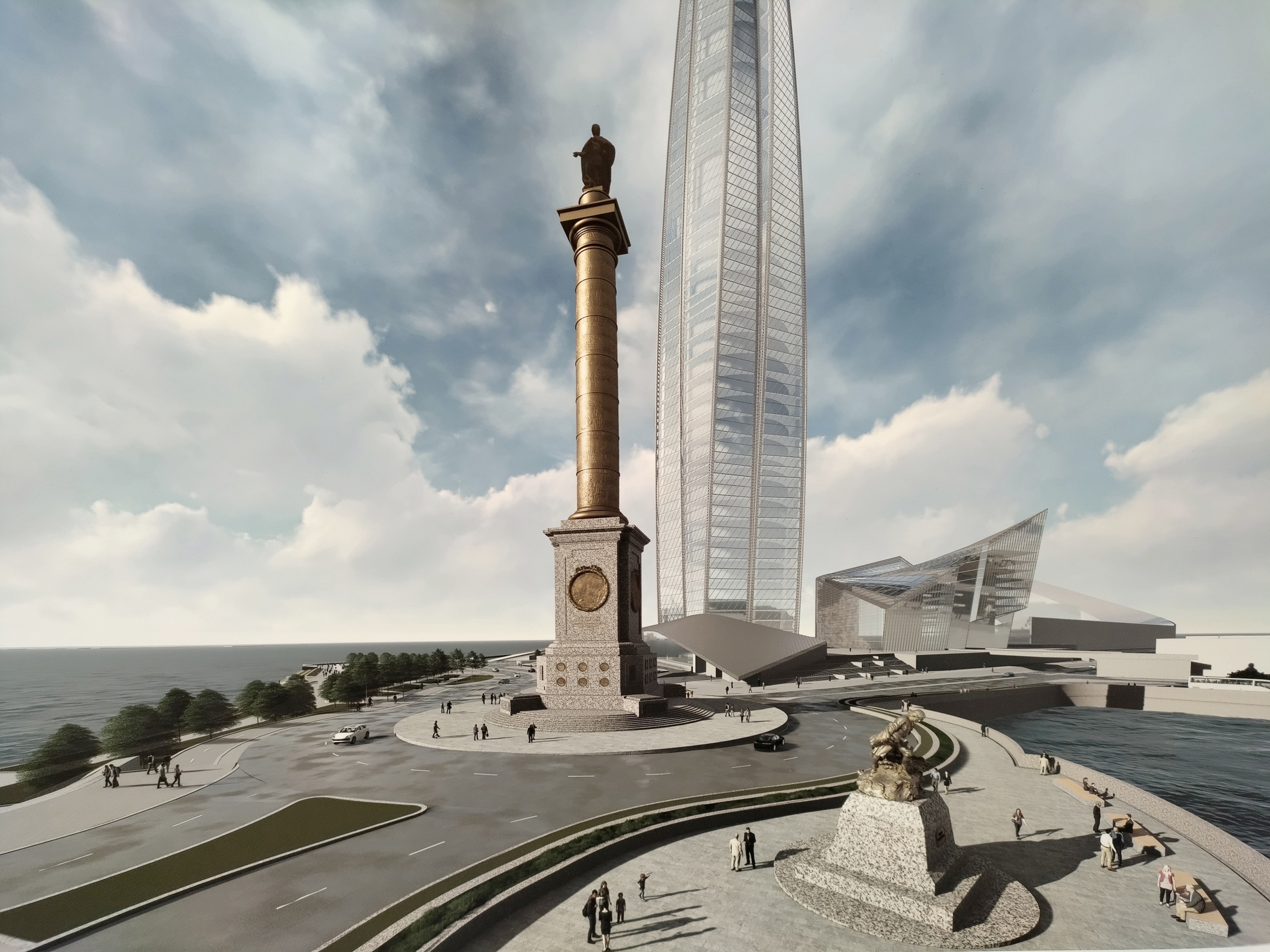 Когда проект столпа вынесли на Градсовет, он вызвал там смешанные отзывы. Как будет смотреться колонна в соседстве с небоскрёбом (причём такая большая, что её можно будет видеть из окон не самых первых этажей высотного здания)? Иногда здания в форме каркаса смотрятся интереснее, чем в достроенном виде, а в других случаях результат превосходит рендеры. Похоже, здесь тот случай, когда итоговую панораму можно будет оценить только по факту. Сейчас предстоит работа по облицовке постамента, а на заводе уже работают над медальонами и другими металлическими конструкциями. В фонде "Газпром культурные инициативы" говорят, что работы идут по графику, подробности обещали сообщить позже.