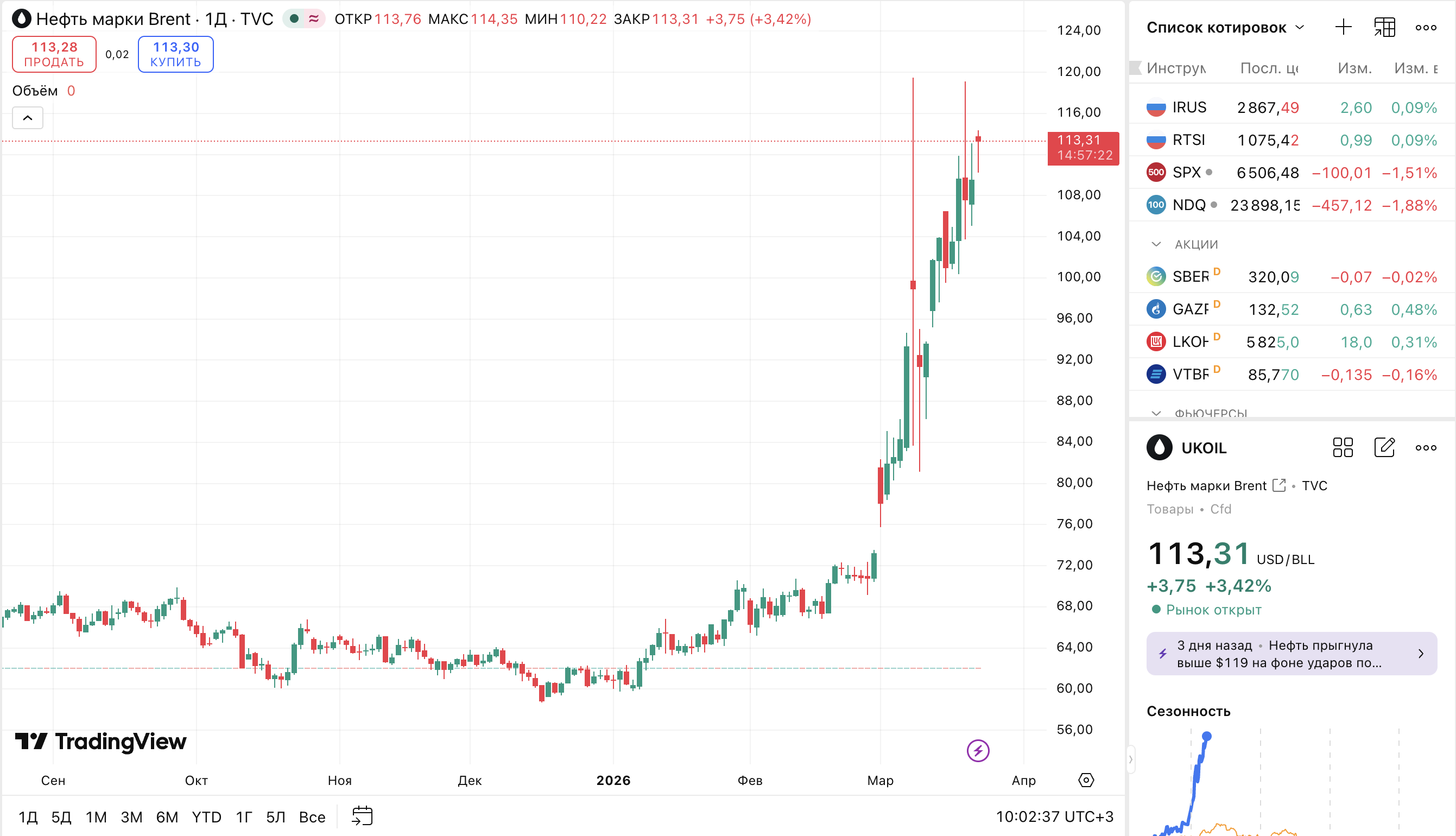 Напомним, 9 марта цена нефти марки Brent взлетела до $111 за баррель впервые с июня 2022 года. На пике цена достигала $119 за баррель. Рост стоимости нефти продолжался с начала марта на фоне военных действий в Персидском заливе и блокировки Ираном Ормузского пролива.