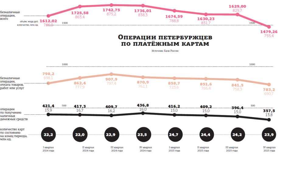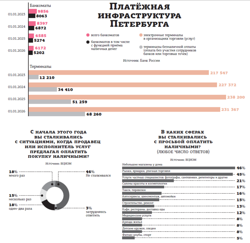 Настойчивость, с которой бизнес предлагает покупателям расплачиваться наличными, частично объясняется затратами на эквайринг. Его стоимость в I квартале 2026–го увеличилась ровно на размер ставки НДС. Если до января 2026 года компания платила за каждую операцию эквайринга комиссию 1,5–3%, то сейчас — 1,8–3,7%. Часть банков изменила тарифы с января, часть — с февраля. Платёжные операторы в лице НКО (небанковские кредитные организации) решили отложить повышение до II квартала. При этом, по данным ЦБ РФ, по итогам 2025 года впервые за все последние годы в Петербурге снизилось число pos–терминалов в торговле — на 3%, или на 7 тыс. единиц. То есть точек, где можно заплатить картой, вроде бы действительно становится меньше.