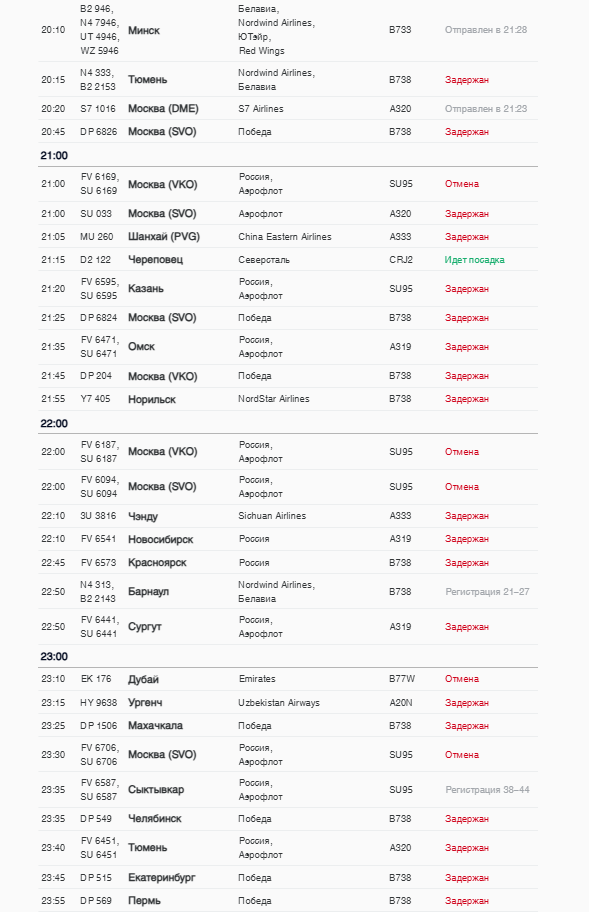 Первые задержанные рейсы уже начали вылетать из аэропорта. Первым в 21:23 вылетел рейс в московский аэропорт Домодедово, он был задержан более чем на час. Самолёт в Минск вылетел с задержкой 1,5 часа.