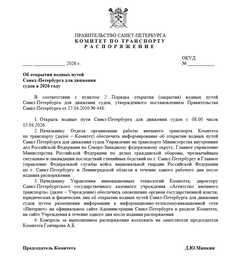 Документ подписал глава комитета по транспорту Петербурга Денис Минкин, контроль за выполнением распоряжения возложен на замглавы Комтранса Алексея Гончарова.
