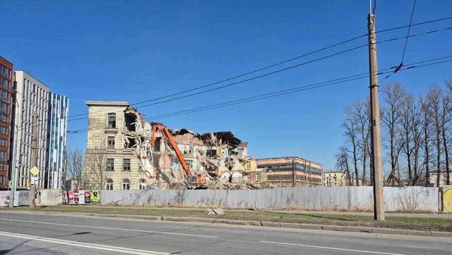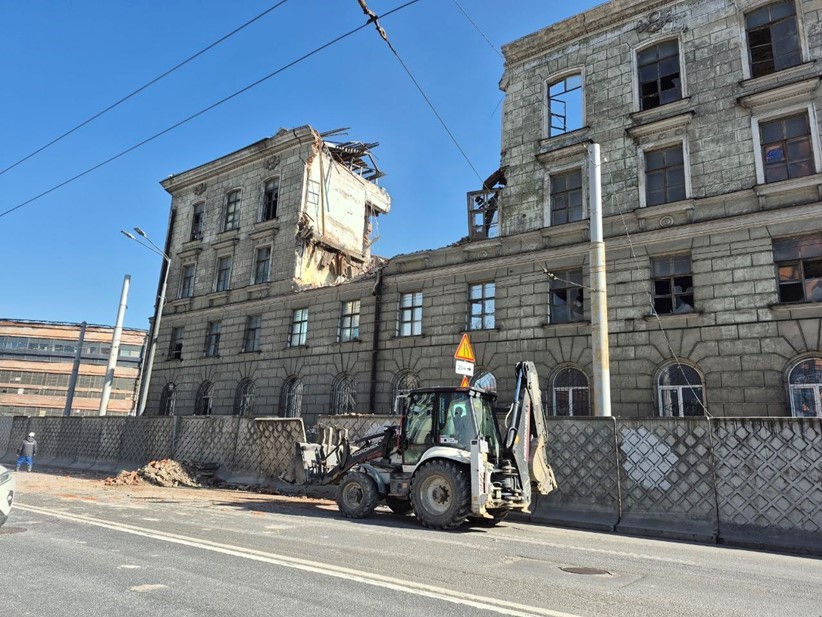 Часть фасада обрушилась на проезжую часть во время сноса здания бывшего Научно-исследовательского центра ракетных войск и артиллерии (НИЦ РВиА) на Хрустальной улице, 1, сообщили в телеграм-канале "SOS СПб СНОС".
