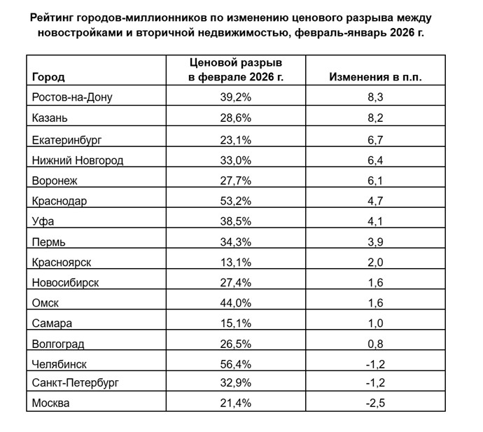 Что касается всей России, к концу зимы ценовой разрыв между первичным и вторичным рынками составил 30,4%, увеличившись на 2,5% по сравнению с январём 2026 года, когда разрыв составлял 27,9%. Медианная стоимость м2 на вторичном рынке по РФ снизилась за месяц на 1,6% до 157 тыс. рублей, а на первичном рынке — увеличилась на 0,3% — до 205 тыс. рублей. Наиболее заметен рост ценового разрыва в феврале в Казани, Екатеринбурге, Нижнем Новгороде и Воронеже.