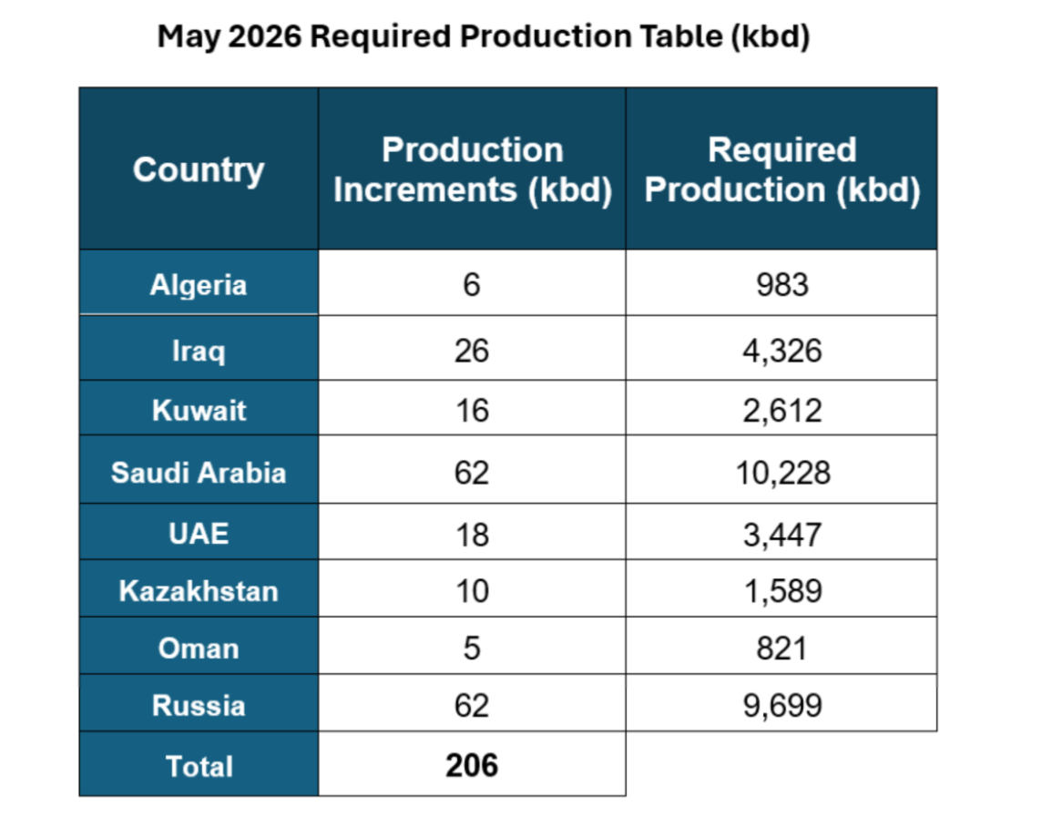 Квота РФ на добычу нефти в апреле 2026 года составит 9,637 млн б/с, Саудовской Аравии — 10,166 млн б/с, Ирака — 4,299 млн б/с, ОАЭ — 3,429 млн б/с, Кувейта — 2,596 млн б/с, Казахстана — 1,579 млн б/с, Алжира — 977 тыс. б/с, Омана — 816 тыс. б/с без учёта компенсаций перепроизводства.