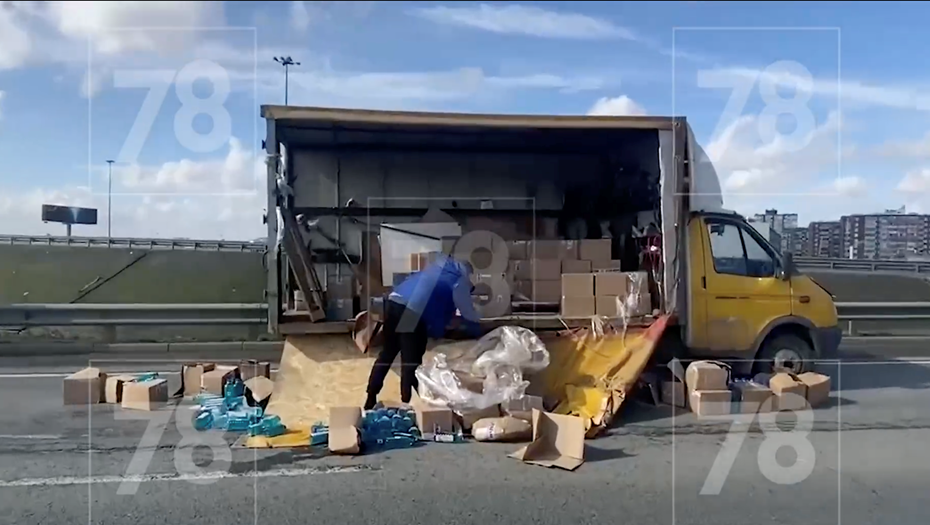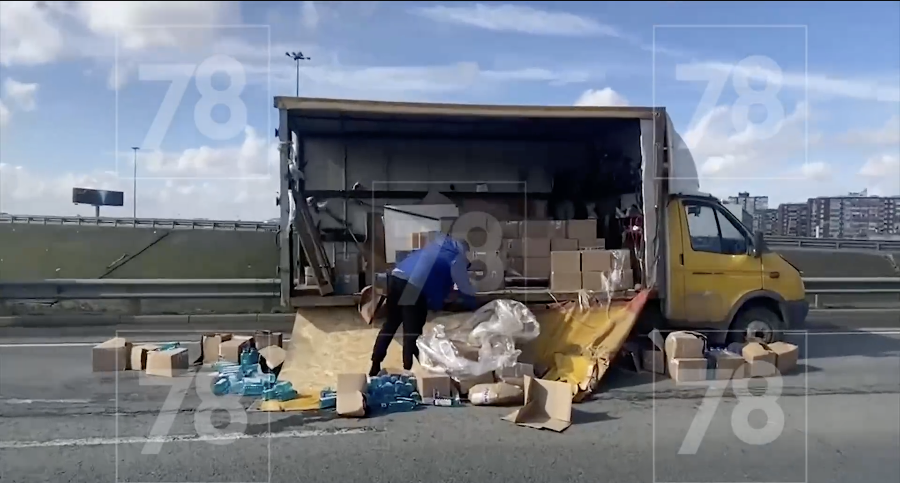 В результате резкого движения в кузове опрокинулся поддон, упаковки с товаром выпали на дорогу, жидкость из них вытекла на проезжую часть.