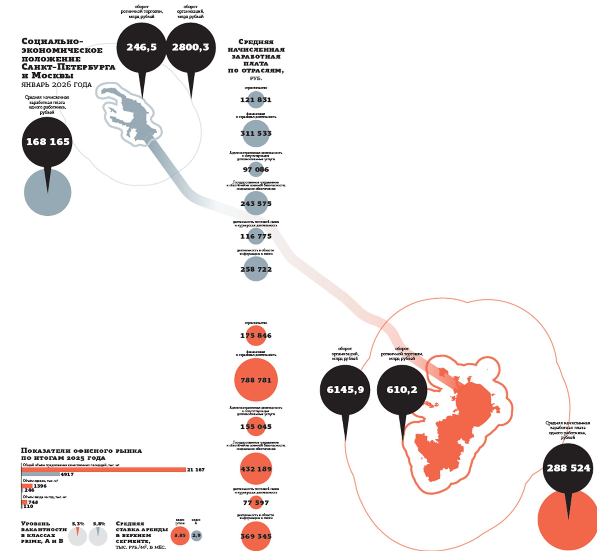 Второй важный фактор — зарплаты сотрудников. По данным Мосстата, в январе 2026 года средняя номинальная начисленная заработная плата в Москве составляла 288,5 тыс. рублей. Аналогичный показатель для Петербурга — 168 тыс. рублей. По отдельным отраслям разница может составлять более 100% (см. инфографику).