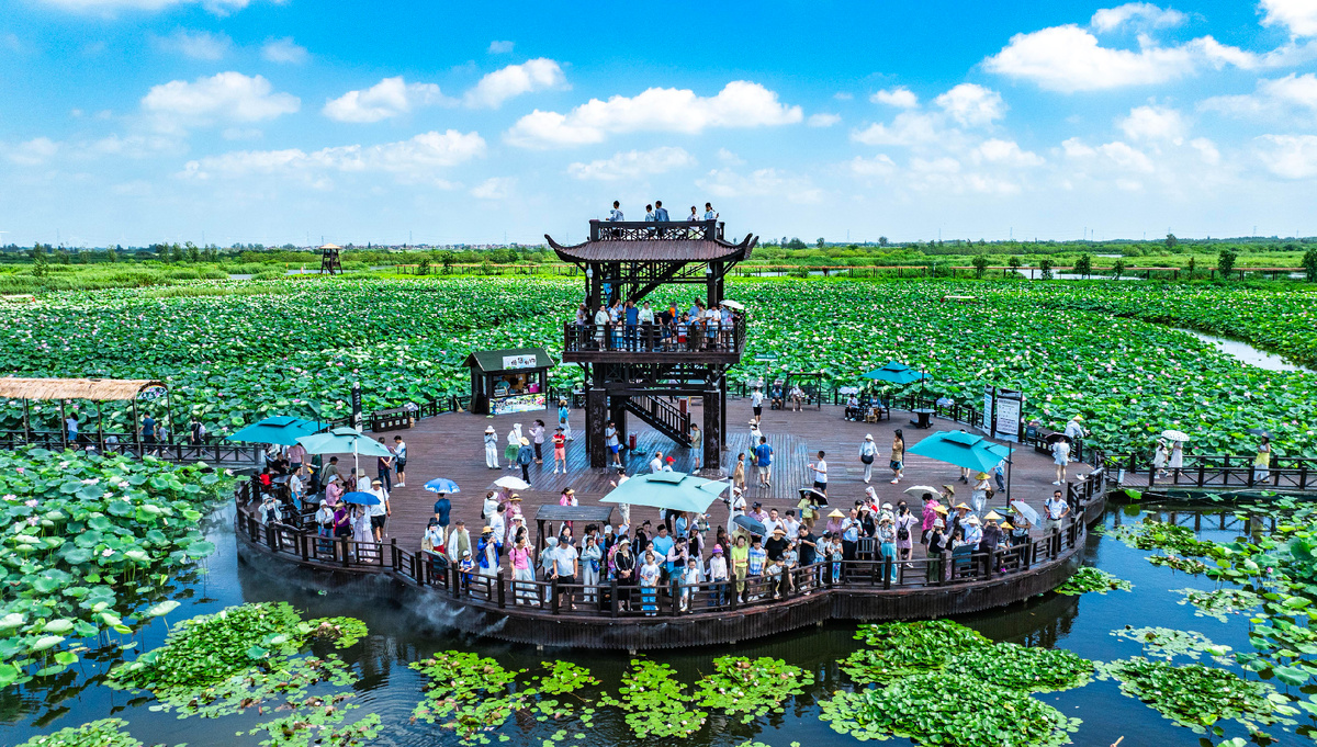 Туристы на поле цветущих лотосов в провинции Цзянсу на востоке Китая.