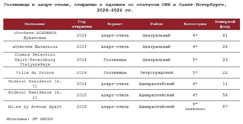 В Петербурге по состоянию на апрель 2026 года в качественном номерном фонде насчитывается 25 тыс. юнитов. Из них 15% находятся в объектах культурного наследия, 30% — в исторических зданиях без охранного статуса, подсчитали аналитики NF Group.