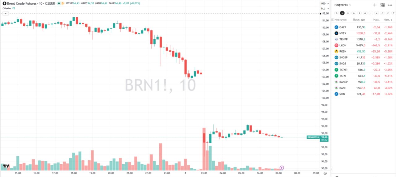Мировые цены на нефть марки Brent снизились на 16% на фоне сообщений о достижении двухнедельного перемирия между США и Ираном.