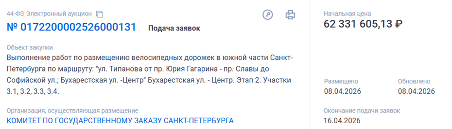 На эти деньги предполагается обустроить велосипедные дорожки в южной части Петербурга по маршруту: "ул. Типанова от пр. Юрия Гагарина — пр. Славы до Софийской ул.; Бухарестская ул. — Центр", этап 2, участки 3.1, 3.2, 3.3, 3.4.