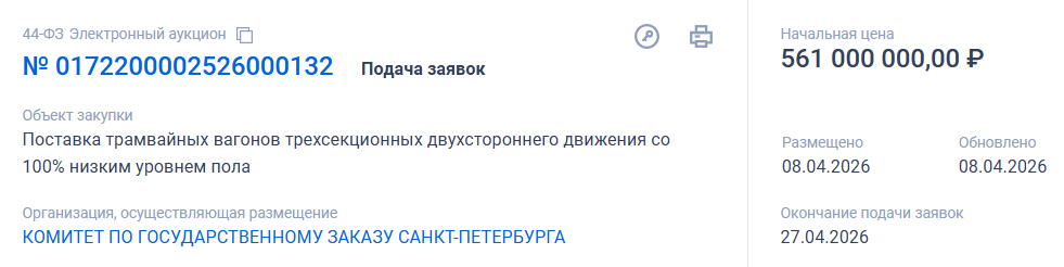 В рамках данного электронного аукциона предполагается поставка трёхсекционных трамвайных вагонов двухстороннего движения со 100%-но низким уровнем пола.