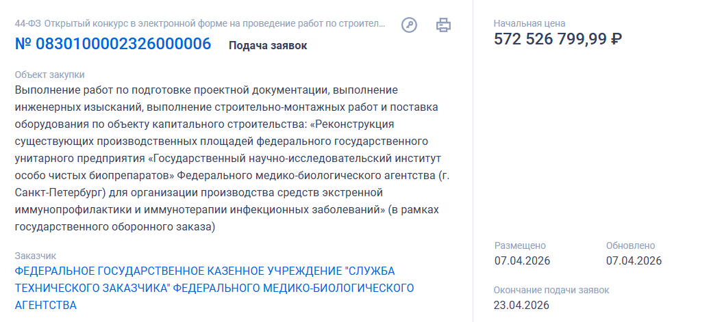 Предполагается подготовка проектной документации, выполнение инженерных изысканий, строительно-монтажные работы и поставка оборудования для Государственного научно-исследовательского института особо чистых биопрепаратов ФМБА. Работу проведут для организации производства средств экстренной иммунопрофилактики и иммунотерапии инфекционных заболеваний в рамках гособоронзаказа.