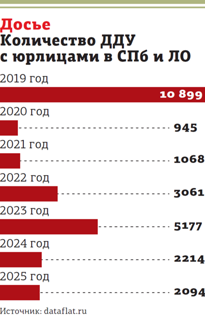 По данным Dataflat.ru, за прошлый год юридические лица оформили в Петербурге и Ленобласти около 2 094 договоров долевого участия: 1 967 в городе и 127 в области. Это около 3,5% рынка (59,5 тыс. ДДУ) — почти столько же, сколько и годом ранее. Однако изменился состав покупателей: если ещё в 2024 году заметную роль на рынке играли ЗПИФы и другие инвесторы, то теперь львиную долю сделок формируют выкуп городом квартир у застройщиков и самовыкуп жилья.
