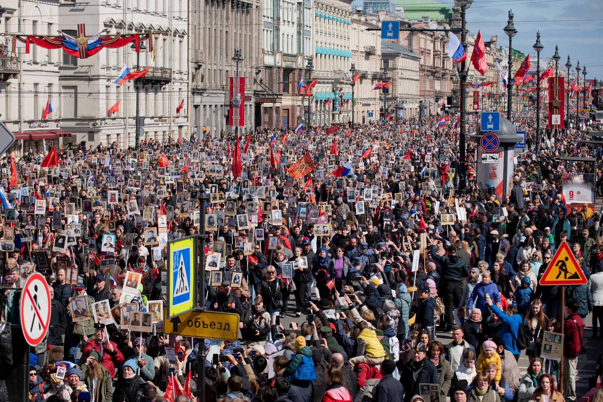 В 2025 году, на 80-летие Великой Победы, "Бессмертный полк" на Невском проспекте собрал 1,1 млн человек. Народная акция прошла в Петербурге в очном формате, участники пронесли по главной улице города портреты родных из поколения победителей — воинов, тружеников тыла, жителей и защитников блокадного Ленинграда.