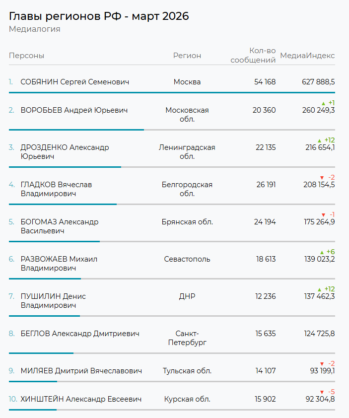 Губернатор Ленинградской области Александр Дрозденко и губернатор Петербурга Александр Беглов в марте 2026 года попали в топ-10 медиарейтинга глав субъектов РФ, следует из данных "Медиалогии".