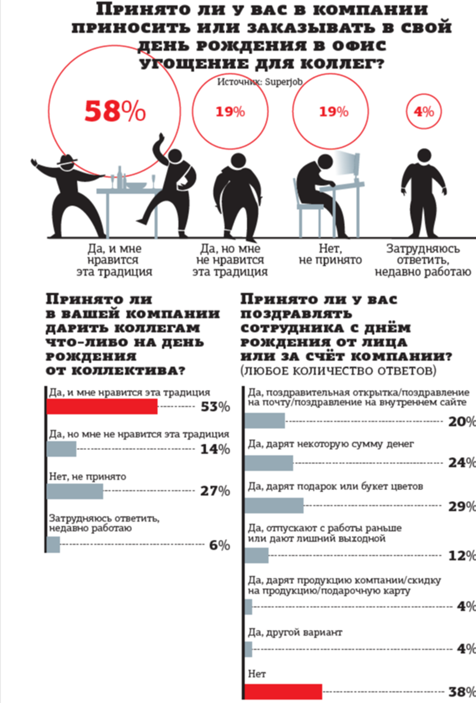 В 2014 году о "конвертах" на день рождения рассказывали 29% опрошенных представителей кадровых служб и менеджеров по персоналу. В 2020 году их набралось уже 34%, в опросе–2026 — только 24%. Цветы и подарки в 2014 году дарили 36%, затем доля сократилась до 33–34% и к нынешнему году дошла до 29%. Ограничиваются поздравлением по почте или в рабочем чате 20%. В 2014 году это считали достаточным 18%. Зато в 2020 году заметен взлёт виртуальных поздравлений до 31%, очевидно связанный с массовым переходом на удалёнку и выстраиванием новых коммуникационных цепочек.