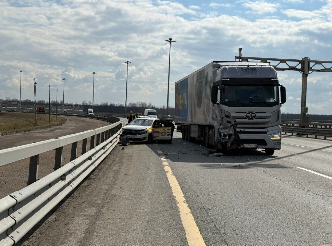 На Западном скоростном диаметре (ЗСД) в Петербурге произошло ДТП с участием фуры и такси, передают очевидцы.