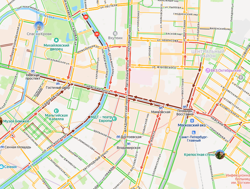 Согласно данным сервиса "Яндекс Карты", полностью перекрыт участок Невского проспекта от Литейного проспекта до улицы Маяковского. При этом пробки уже растянулись по Невскому от площади Восстания до Казанского собора, также заторы скопились на Лиговском проспекте, улице Восстания, набережной Фонтанки, Садовой улице, улице Марата.