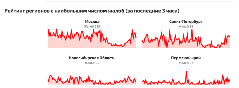 Как сообщается на сайте сбой.рф, Петербург занимает второе место в рейтинге регионов с наибольшим количеством жалоб на работу мобильной связи за последние 3 часа. На данный момент на платформе зарегистрировано 85 жалоб.