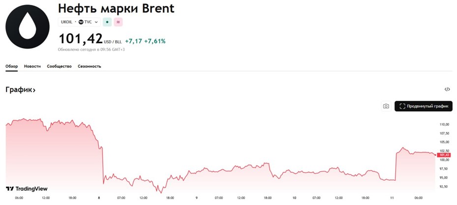 После провала переговоров США и Ирана в Пакистане и заявления президента США Дональда Трампа о начале блокады Ормузского пролива, цена на нефть марки Brent резко выросла на 7,8%, следует из данных сервиса TradingView. В моменте цена превысила $103,5, сейчас баррель нефти торгуется в районе $101.