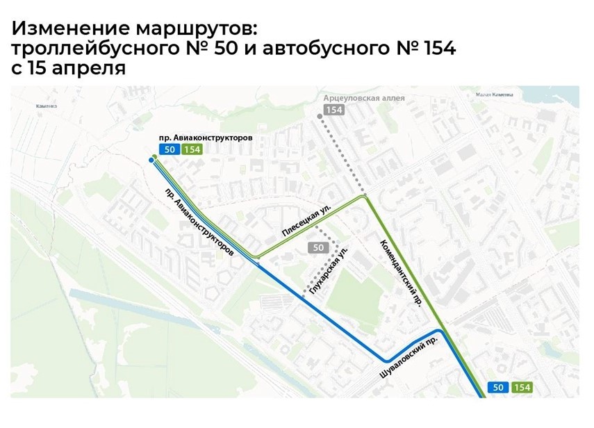 Кроме того, изменится расписание автобусов № 469 и 485. Маршрут автобуса №154 и троллейбуса №50 продлят по новому участку пр. Авиаконструкторов. Автобус будет следовать от станции "Старая Деревня" до конечной остановки "Проспект Авиаконструкторов, угол Арцеуловской аллеи". Троллейбус запустят от Тихорецкого пр. до той же остановки.
