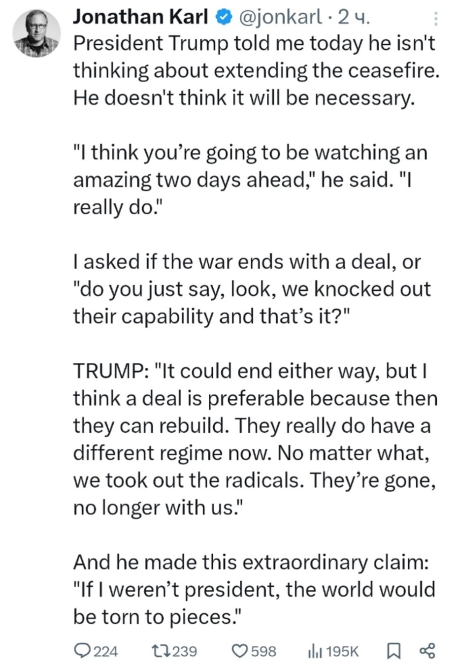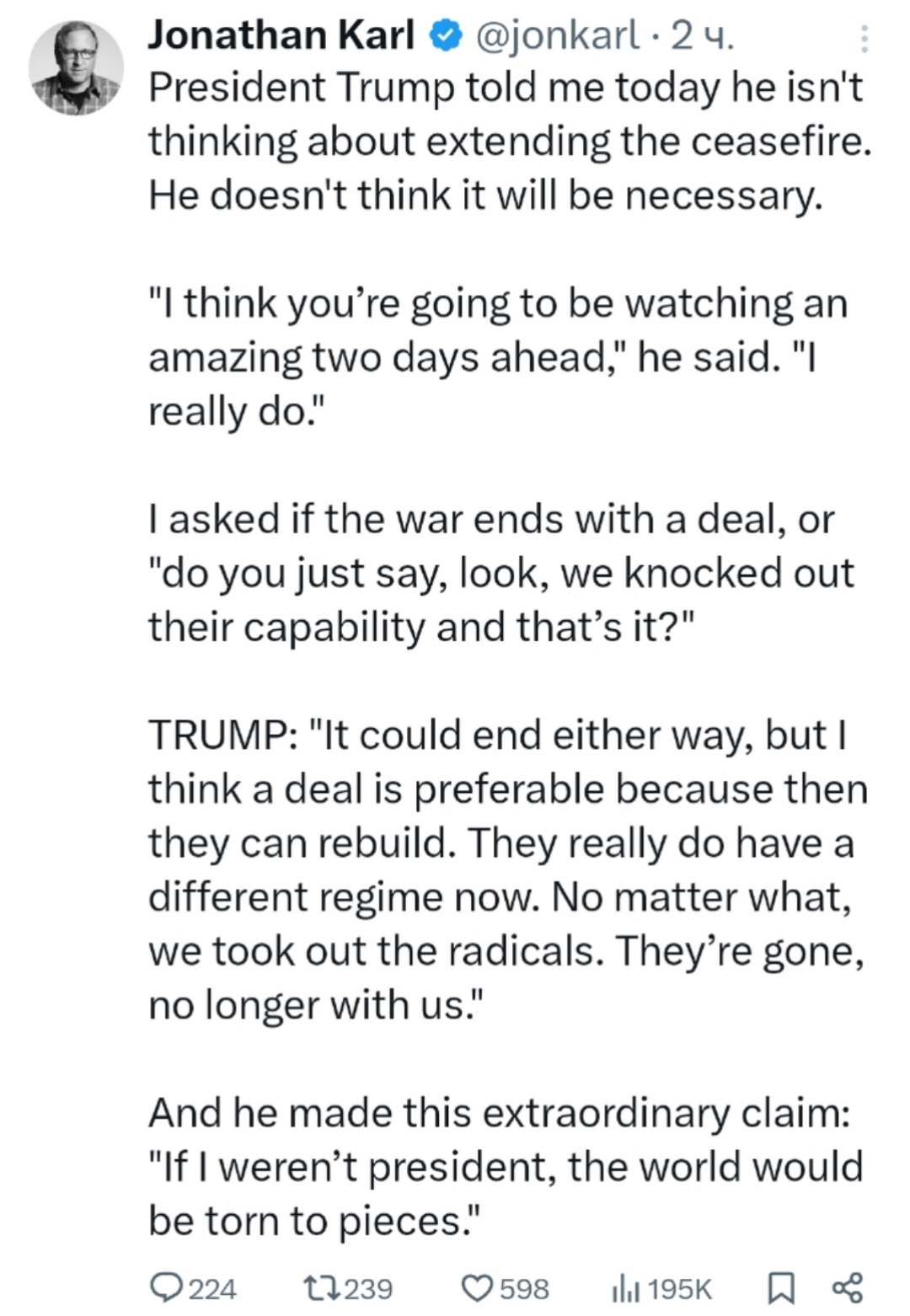 Президент США Дональд Трамп рассчитывает, что необходимости в продлении перемирия с Ираном не будет, сообщил журналист телеканала ABC Джонатан Карл на своей странице в X.