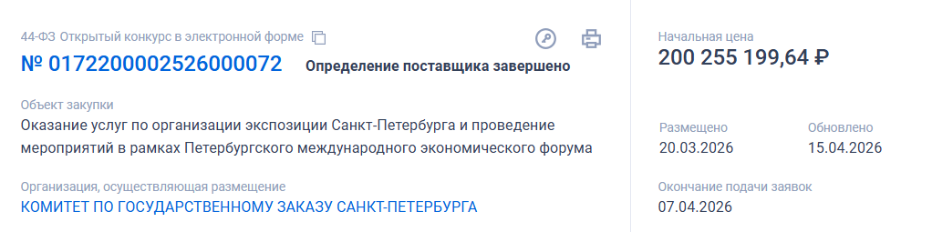 Подрядчику предстоит организовать экспозицию Петербурга и провести мероприятия в рамках Петербургского международного экономического форума (ПМЭФ-2026).
