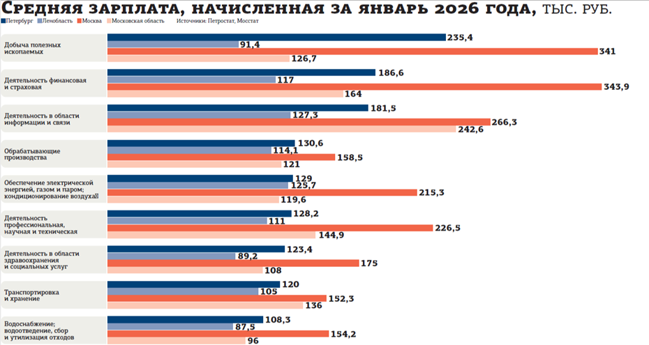 Отслеживать официальную динамику зарплат приходится с отставанием в несколько месяцев. На текущий момент Петростат и Мосстат только–только опубликовали данные по оплате труда за январь 2026 года. Из них следует, что средняя начисленная номинальная зарплата в Петербурге составила 118,8 тыс. рублей, в Ленинградской области — 95,2 тыс. Соответственно, в Москве — 187,6 тыс. рублей, а в Московской области — 124 тыс. В январе 2025 года жители Петербурга в среднем получали 106 тыс. рублей, Ленобласти — 85,6 тыс., Москвы — 156,2 тыс., Московской области — 105,5 тыс.
