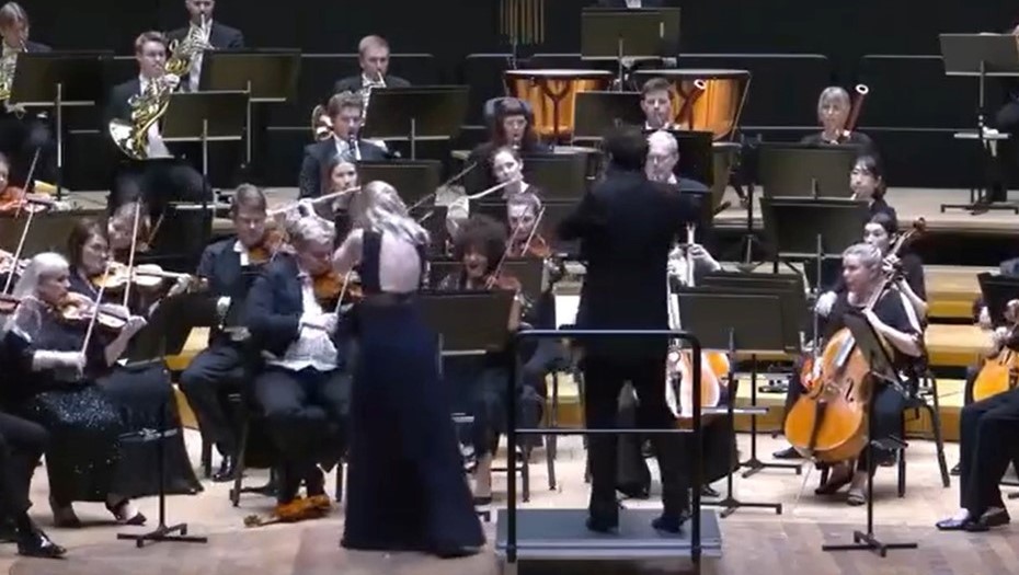 Оркестранты ненадолго вынужденно прервали исполнение музыки, солистка, опомнившись, подняла инструмент. После этого концерт продолжился почти с начала финальной части.